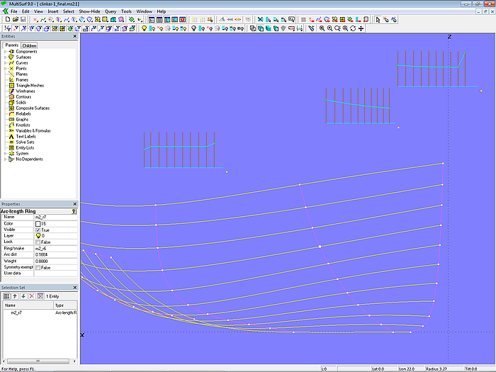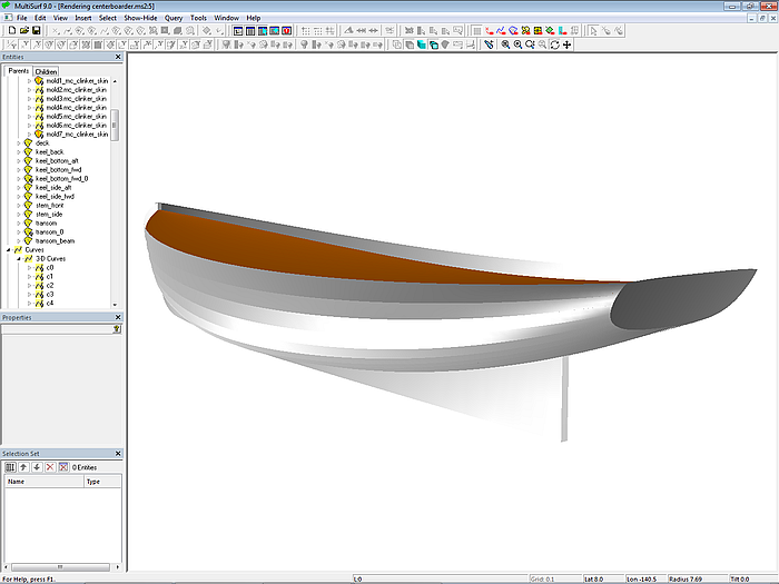 Model centerboarder.ms2 shows a 7 m long centerboard sailboat with a "clinker look." The clinker-skin method is used for the hull definition. The starting point is the C-spline Lofted Surface base_hull, defined with 7 B-spline mcs with 7 cps each. The C-spline Lofted Surface clinker_skin, which looks like a clinker construction, mimics a hull with 12 planks. Except for the top plank, all planks have the same width at each mold.