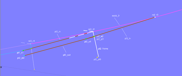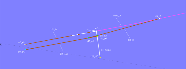 Now, the Offset Point pl1_pt0 is created relative to m3_r1. The 3-point Frame pl1_frame is then defined with m3_r1 (end of inner line), m3_r0 (beginning of inner line), and pl1_pt0. At the distance of the plank thickness (0.010 m) from the origin in X-direction of this frame Point pl1_pt1 is located. Using pl1_pt1, m3_r1, and m3_r0, the Copy Point pl1_pt2 is defined.