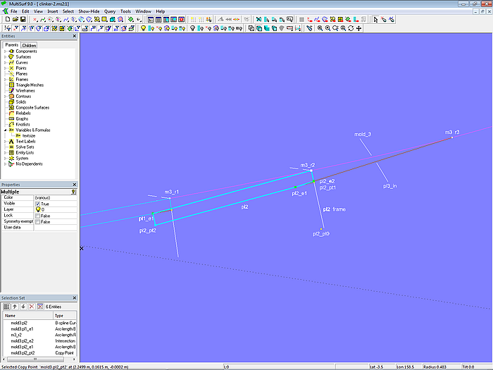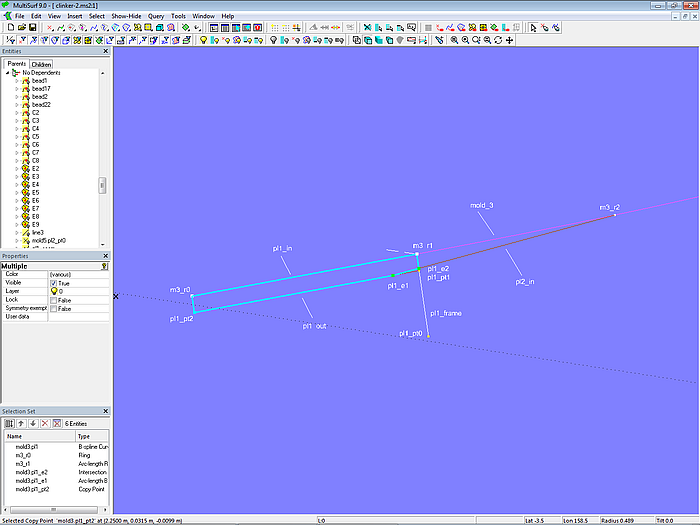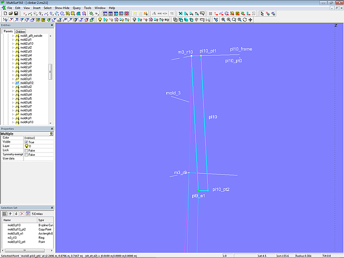 The plank cross-sections at molds 2 and 4 and at the stern (mold 5) are created in the same way as shown for mold 3. Since a significant number of objects needs to be generated, it is convenient to accomplish this using the Component cl_planks-10.mc2. The parents of this component are the start point of the mold curve, the following mold points and the end point of the mold curve.