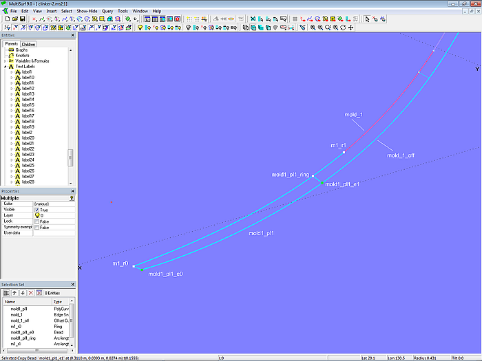 This means, for example, we need to set 9 points on the Intersection Snake mold_3. For this we use the Point type Arc-length Ring. The result are the Arc-length Rings m3_r1, m3_r2 ... m3_r9. The points m3_r2, m3_r3 ... m3_r9 are each separated by 0.1292 m.