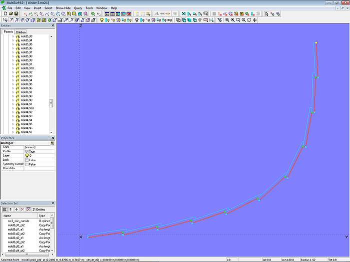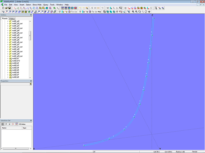 This is model clinker_skin-1.ms2. It is used to create the Component cl_skin.mc2. It requires the mold curve (Snake) and the mold points (Rings) as parents; the result is the complete master curve for the outer skin.