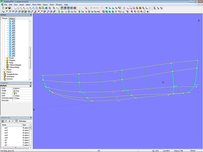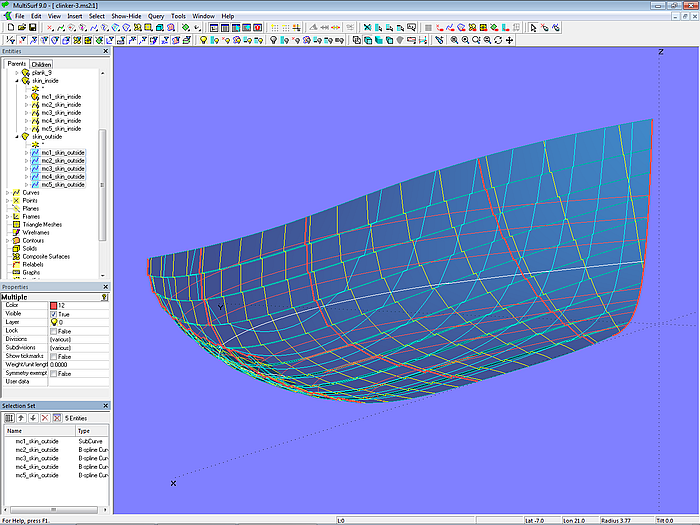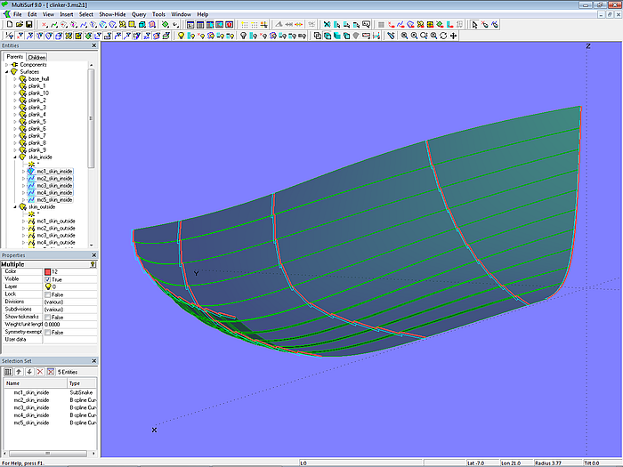 By a selection of points, already determined for the plank cross-sections, master curves can be generated for a single C-spline Lofted Surface that describes the entire outer surface of the clinker hull. In a similar way the inner surface can be determined. This is shown in model clinker-3.ms2.