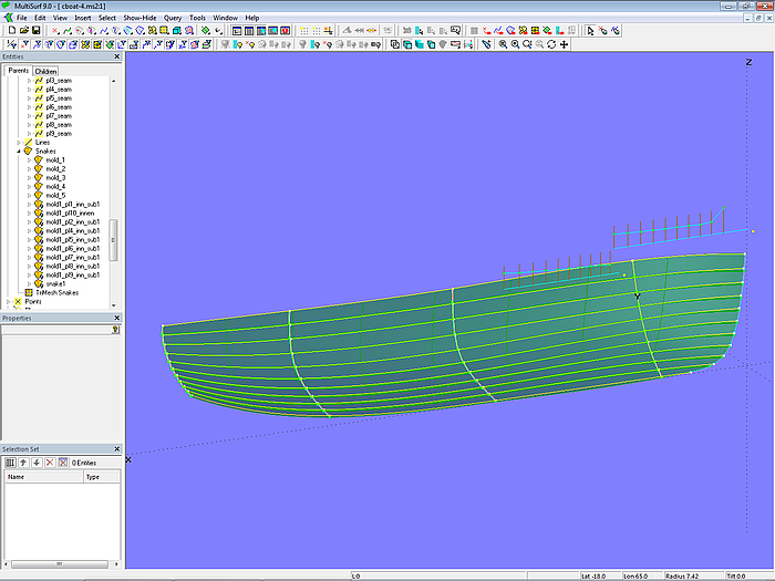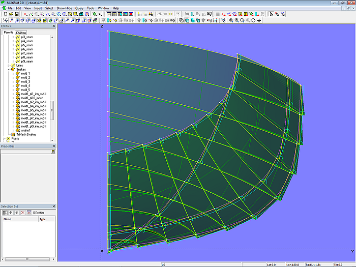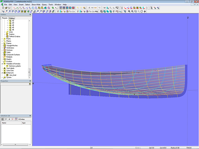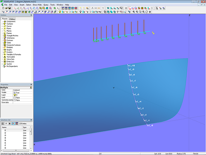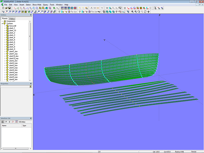 If we model a boat hull in MultiSurf that is to be built using the carvel construction method, we generally do not need to worry about the individual planks. It is sufficient to create the lines for a hull surface that has the desired shape. Dividing the surface into planks would then be a task during the actual building of the boat. However, if desired for work preparation purposes, this can also be done in MultiSurf. See:75 sqm Yacht – from screen to sea