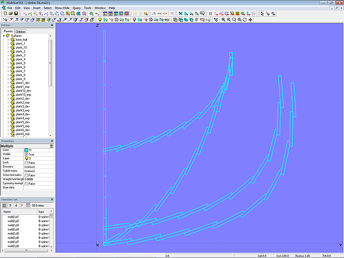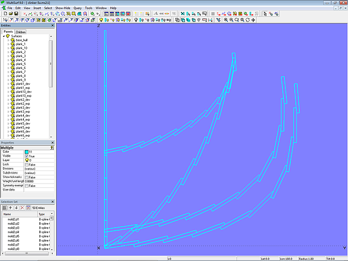Chapter 2, Section 2.5 describes how the plank cross-sections at the molds can also be used to create a single outer surface of the clinker hull. However, if the main task is to model a hull surface for a GRP boat that simply resembles clinker construction, the method shown in model clinker_skin-1.ms2 can be used ("clinker look"). It requires much less modeling effort.