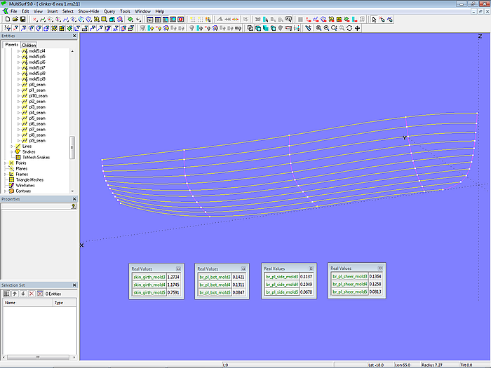 The plank seam curves have no dependent objects. They are only used to indicate whether the plank widths change evenly longitudinally and whether the plank run looks good. In other words, whether the mold points on the molds are harmoniously arranged. For example, in the bow area, the lower seams show an inflection point in side view. This can be corrected by moving the points on mold_1 and mold_2 accordingly. However, care must be taken to ensure that the spacing of the mold points along a mold curve does not change irregularly.
