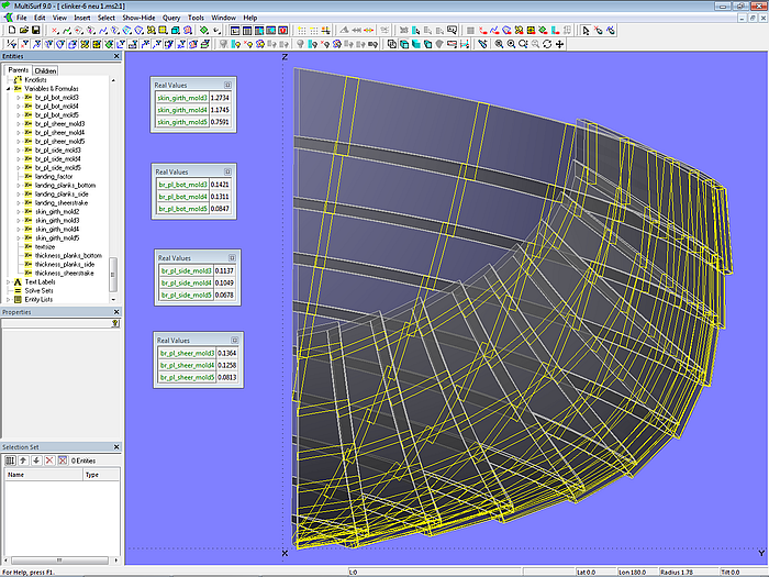 Let us consider model clinker-6.ms2. The 10 hull planks consist of 4 bottom planks, 0.014 m thick, 5 side planks, 0.013 m thick, and the sheer plank, 0.017 m thick. Variable thickness_planks_bottom determines the thickness of the bottom planks, Variable thickness_planks_side determines the thickness of the side planks, and Variable thickness_sheerstrake determines the thickness of the sheer plank. The Variable landing_factor is the factor for the landing, chosen here as 1.8. The Formulas landing_planks_bottom, landing_planks_side, and landing_sheerstrake calculate the respective landing widths of the plank strakes.