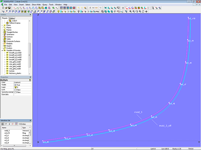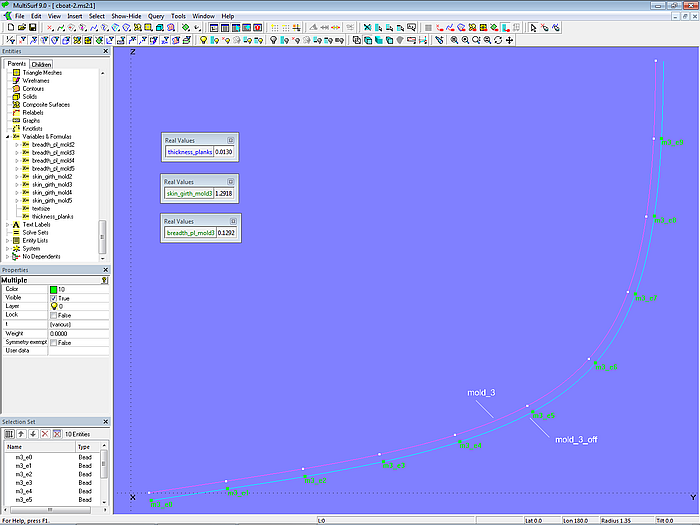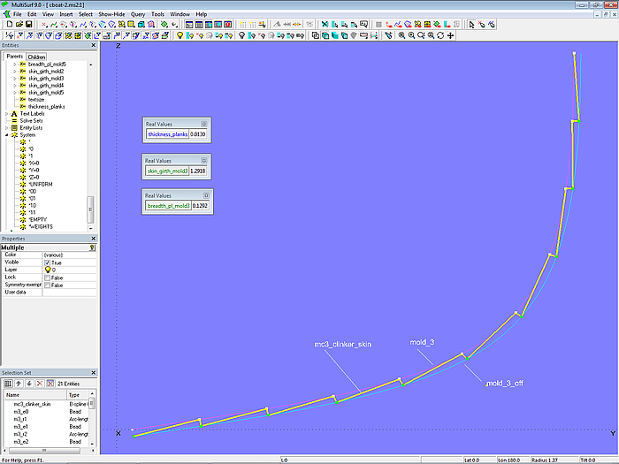 The values of these variables and formulas are then used to define the control points for the plank seams and the plank cross-sections. In the described method, the mold points are therefore not manually positioned; they are derived from the specifications. The points of mold 1 and mold 2 are freely positioned so that the plank seams do not have a distinct inflection point, as in model clinker-1.ms2.