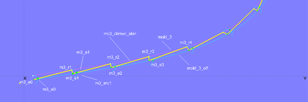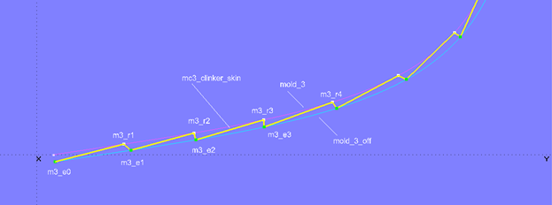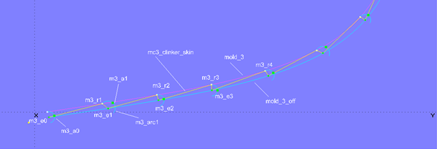 To answer this question, a series of semicircles (Arc, Type = 6) are added to the model clinker_skin-1.ms2. Point1 (starting point) is each a mold point on mold_3, Point2 (center point) is the corresponding Bead on mold_3_off, and Point3 is the subsequent mold point. For example, Arc m3_arc1 is created with m3_r1 for Point1, m3_e1 for Point2, and m3_r2 for Point3.