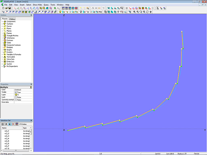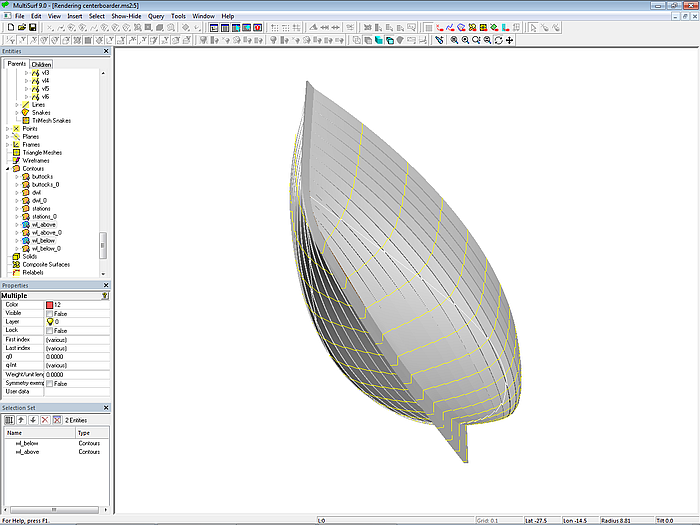 The C-spline Lofted Surface base_hull is now supported by mc1 to mc6. This, in turn, is intersected by Contours to display stations, waterlines, buttocks. By moving the cps of the mcs the hull surface is then faired.