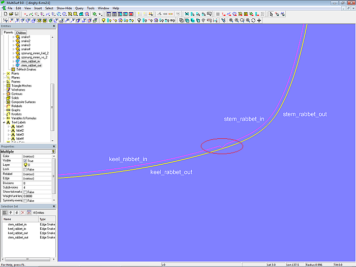 So far, so good. A closer look at these curves, however, reveals the irregular shape of the inner edge, namely where the two rabbet curves stem_rabbet_in and keel_rabbet_in meet. The Offset Surface base_hull_off also shows this discontinuity.