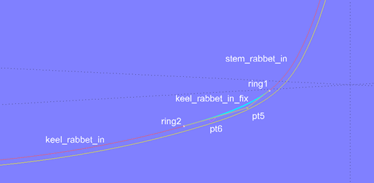 By shifting the cps of the B-spline Curve rabbet_in_fix, it must be ensured that the inner edge of the keel and stem rabbets run harmoniously with the outer edge.