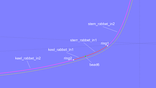 This curve is then divided into the SubCurves stem_rabbet_in1 and keel_rabbet_in1 using Bead bead6. The curve section on stem_rabbet_in starting at ring1 is SubSnake stem_rabbet_in2. Similarly, SubSnake keel_rabbet_in2 defines the curve section from ring2 to the end of keel_rabbet_in along the keel. Finally, these curve sections are combined to form the PolyCurves stem_rabbet_in_fixed and keel_rabbet_in_fixed.