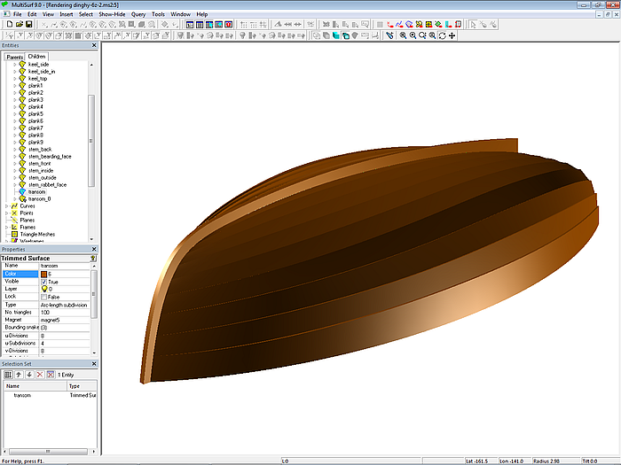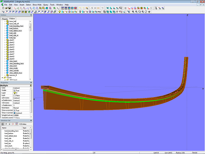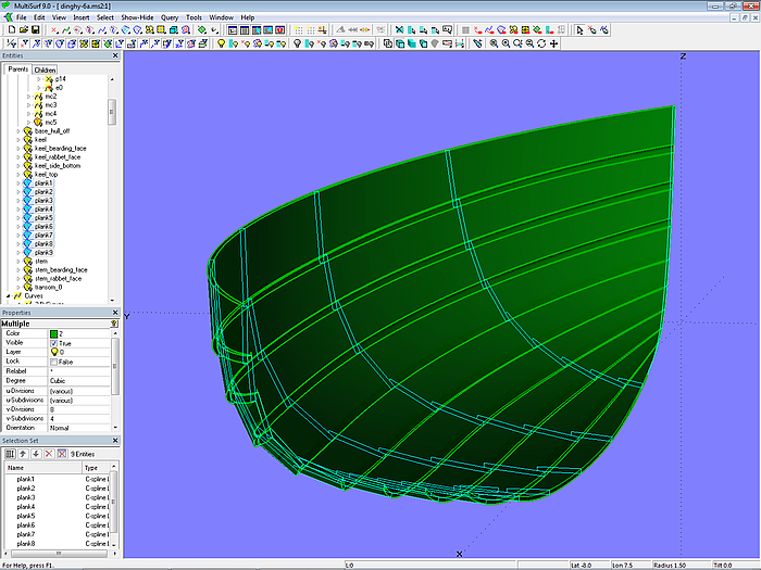 The planks for the model dinghy.ms2 are modeled in accordance with the plank design for the workboat. Each plank is supported by seven cross-sectional master curves.
