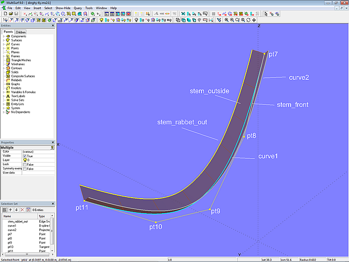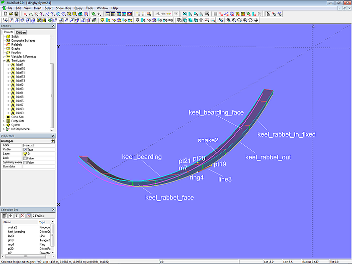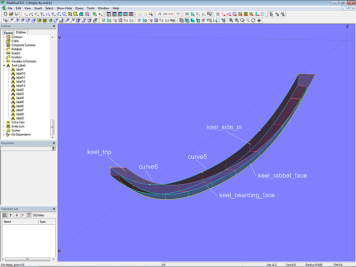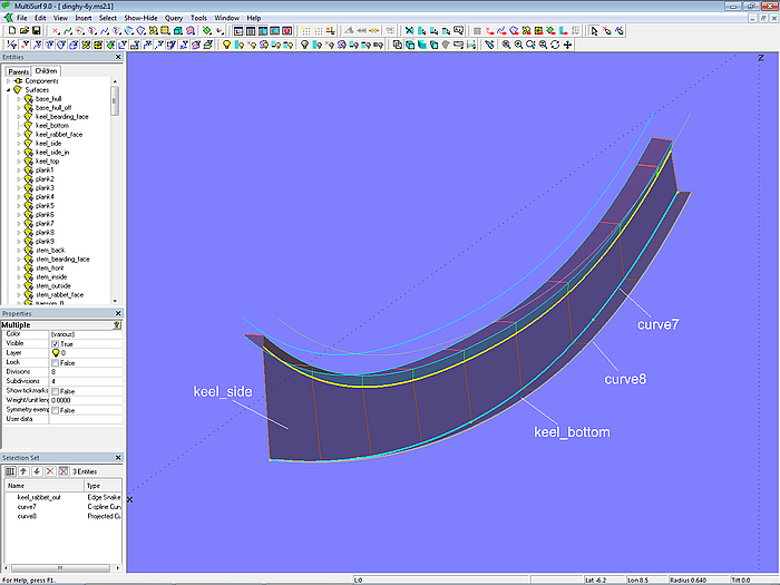 Width and depth of the outer keel are determined by the C-spline Curve curve7. This is projected onto *Y=0 as curve8. The keel side is the Ruled Surface keel_side between keel_rabbet_out and curve7. The keel bottom is the Ruled Surface keel_bottom between curve7 and curve8.