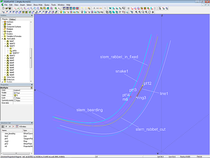 With their inner sides, the planks rest on the stem at the rabbet side. This surface is modeled in the following steps. The edge of the rabbet side that is common to the rabbet front is the PolyCurve stem_rabbet_in_fixed. To produce the outer edge of the rabbet side, the Ring ring3 and its dependent Tangent Point pt12 lie on the EdgeSnake stem_rabbet_out. Both points determine Line line1. Offset Point pt13 is also dependent on ring3. This point is rotated 90° around line1 using the Rotated Point pt14. This, in turn, is then projected onto the base surface base_hull as Projected Magnet m6. In the Procedural Snake snake1 this construction of m6 is repeated for all positions of ring3. Finally, snake1 is offset inward by the plank thickness using the Offset Curve stem_bearding.