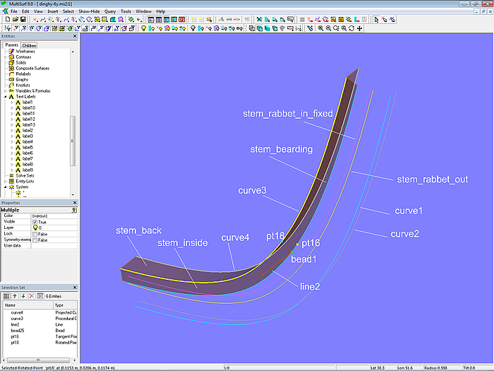 For the inner part of the stem beam the curves, that define its height and width, are still missing. A procedural construction is used to achieve a constant height and width of the back. To do this, the Bead bead1 is set on the Offset Curve stem_bearding. The Tangent Point pt16 depends on this; its offset value determines the inside height of the stem. On bead1 also depends Point pt17; Line line2 runs between both points. Pt16 is now rotated 90° around line2 by the Rotated Point pt18. For all t-values of bead1 this construction is repeated by the Procedural Curve curve3. Its projection to *Y=0 (midship plane) is Projected Curve curve4.