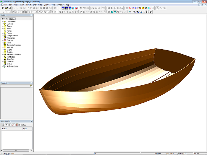 So much for the base surface of the workboat. However, there are no clinker planks to be seen anywhere in the model clinker_0.ms2. Therefore, from here, back to Chapter 2, Section 2.1, Base Hull.