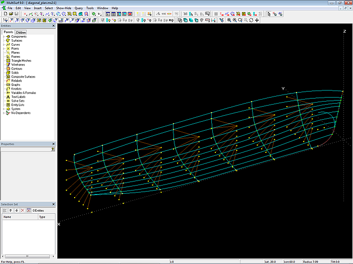 Model diagonal_plan.ms2 shows the diagonal frame structure underlying the measurements. Arc-length Beads are used to position section points along the diagonal lines. Corresponding section points are interpolated by C-spline Curves in both longitudinal and transverse direction. The model is scaled in the X direction so that its length is 5 m.