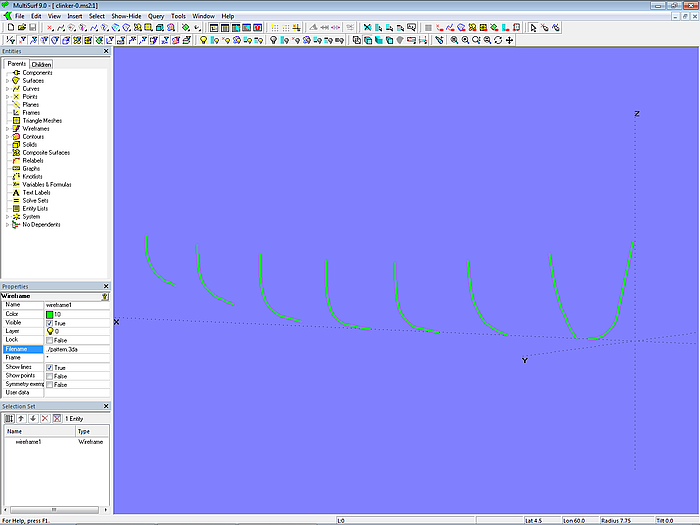 The 3DA file pattern.3da is the template for the creation of the actual round-bilged hull surface. To do this, create a new model, save it with the file name clinker-0.ms2, and insert the 3DA file pattern.3da via Insert/ Wireframe.