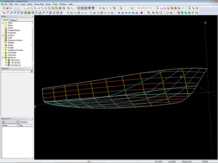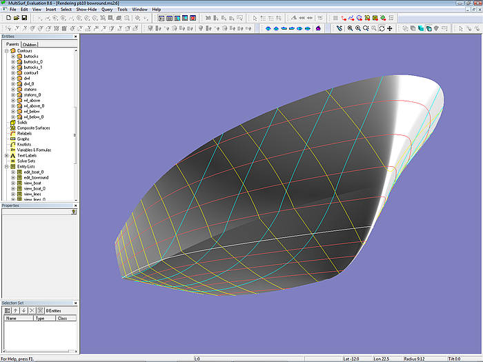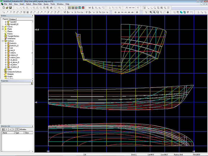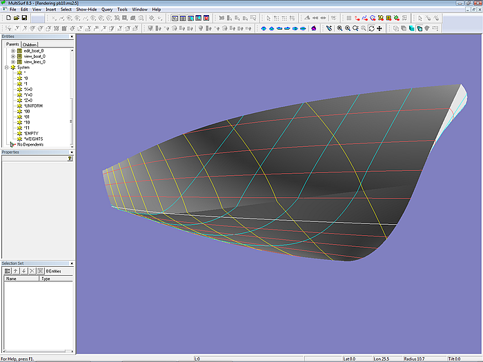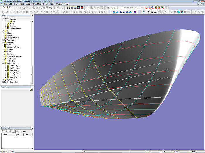 In this article I would like to explain on the basis of the model pb10.ms2 how to create in MultiSurf a standard chine form hull for powerboats. This is not about making a hull with specific dimensions, but shows how the C-spline Lofted Surface can also be used advantageously for this kind of hull shapes.
