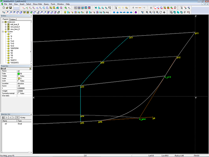 However, this is not MultiSurf-like. Better we make use of the tangency property of B-spline Curves. First, create a line that is tangent to vl5 in its starting point (Line between cp3 of mc1_bot and a Tangent Point based on Bead at t=0 on vl5). Next create a bead on this tangent line and use it as cp2 for the bow mc of the bottom. With this construction the tangent entry of mc1_bot to the fairbody curve of the hull is hardwired into the model.