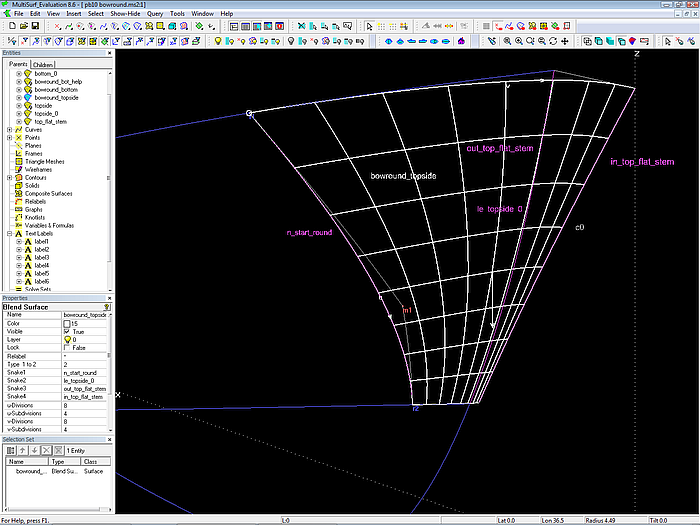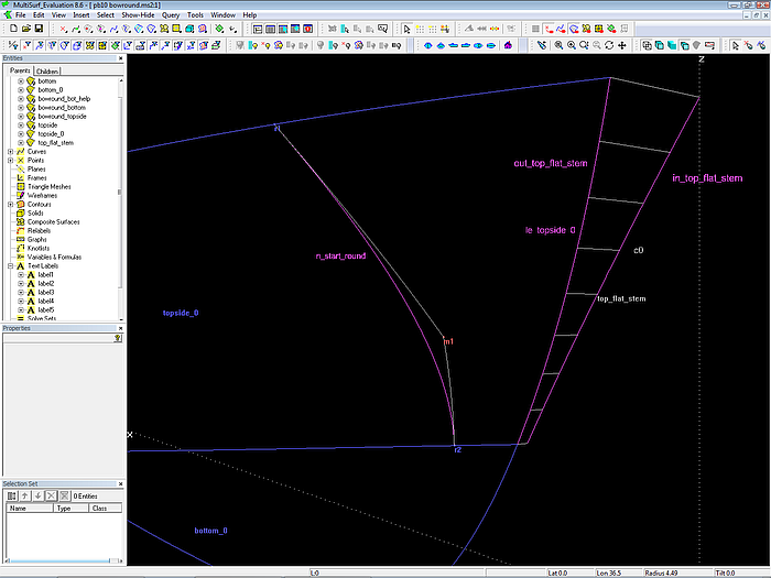 So far the model has a sharp stem. All cps of its bow mcs (mc1_top, mc1_bot) are on the centerplane, their y-coordinates are 0. To add a bow rounding is not difficult, however. This is shown in the model pb10_bowround.ms2.
