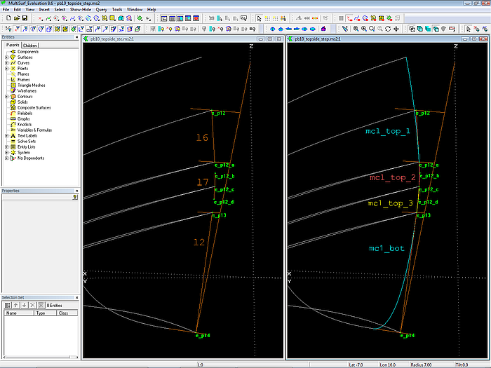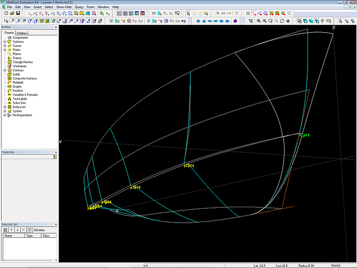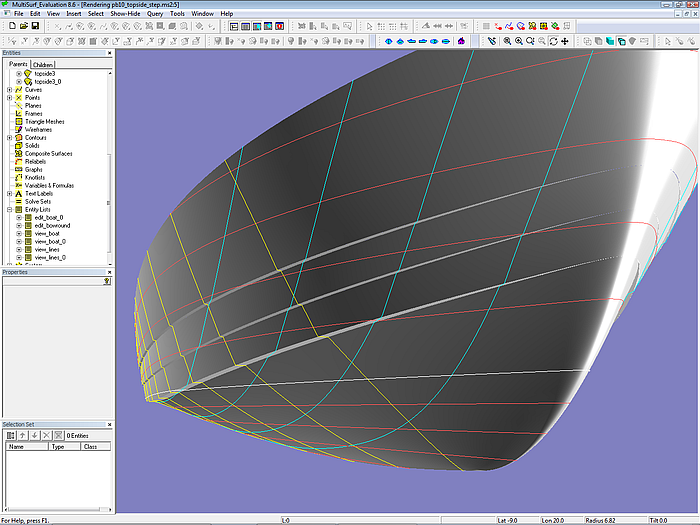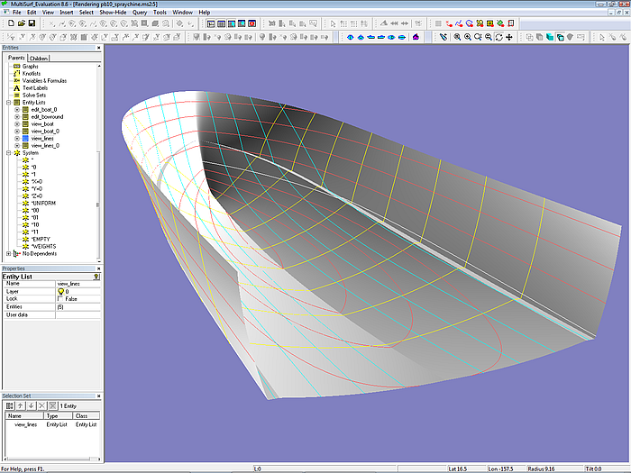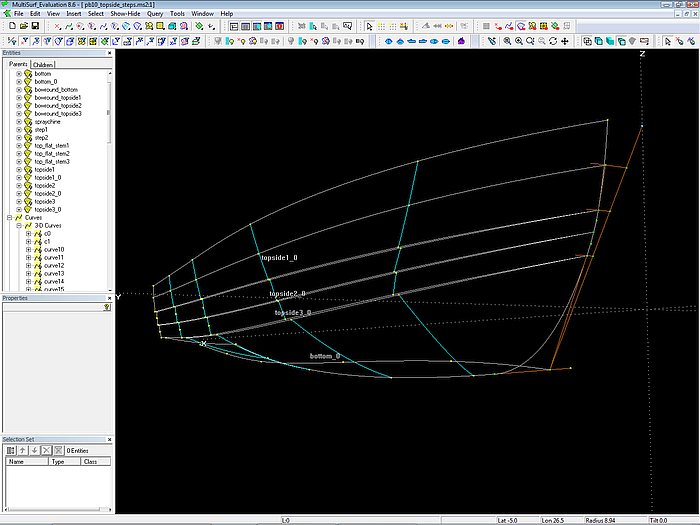 Vertex Curve vl1 corresponds to the sheer, vl3 to the chine, and vl5 to the fairbody curve. They can easily be checked for fairness by using Display Profile/ Curvature.