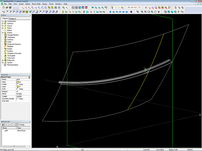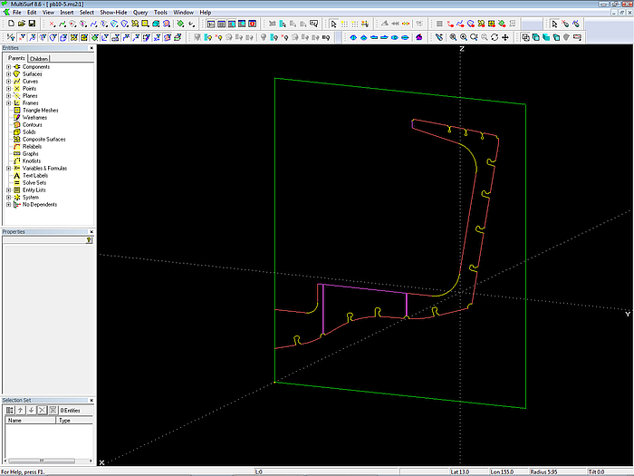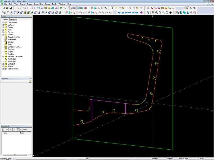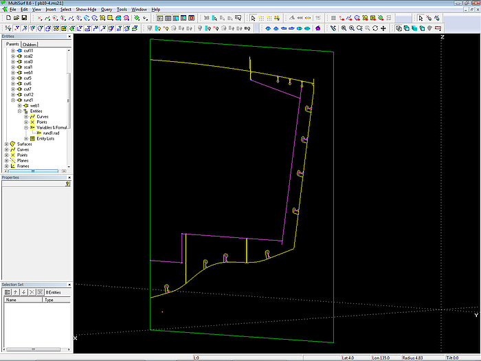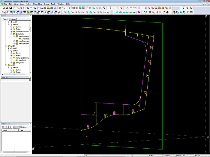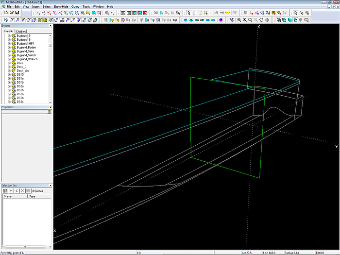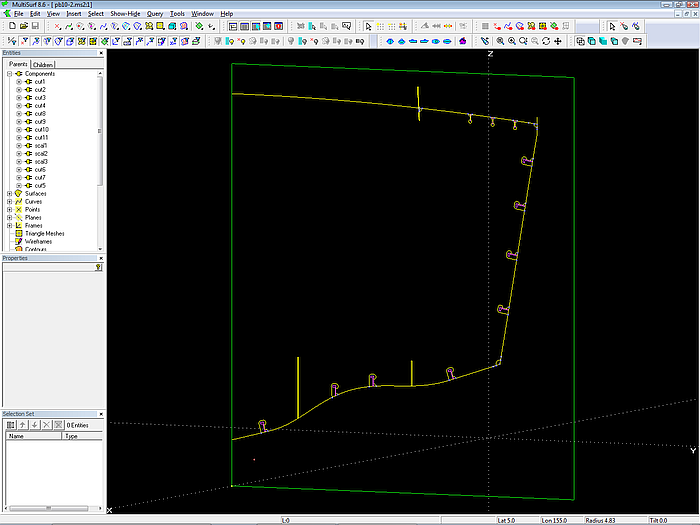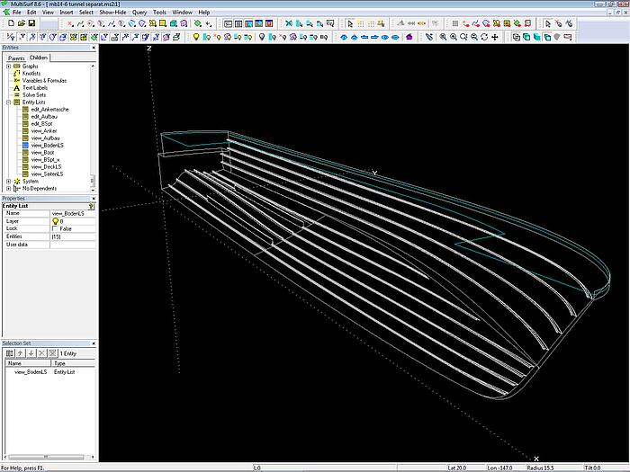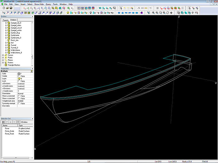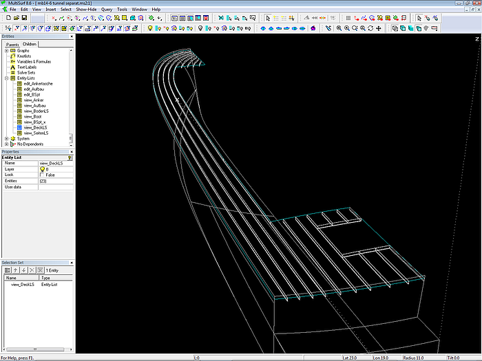 Let us assume we have made the geometry of a standard metal powerboat: surfaces for hull and deck. And we went beyond this ordinary extent and have also added a series of longitudinal frames (stiffeners) to support topside, bottom and deck. Next we would export sections and continue in a cad program in order to define all the flat structural parts required for the construction of the boat. But this means: the world of relational geometry is left. If there will be any change of the model, the cad drawings must be adapted. And certainly, there will be changes. In the following it is shown by the example of a transverse frame, that there is no need to leave MultiSurf for the creation of complex flat parts.
