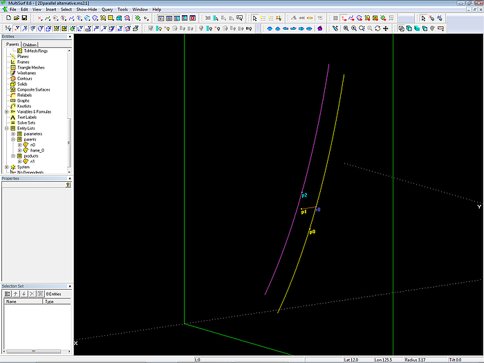 The component principle is this: situated on the basis curve is Ring r0; p0 is a Tangent Point to r0, its offset is equal to the offset of the parallel curve. p0 is rotated by 90° around a line which is perpendicular to the frame basis and passes through r0. The result is Rotated Point p2, which is then projected onto the frame basis as Projected Magnet m1. This is one point of the wanted parallel curve. With a Procedural Snake this construction is repeated for all positions of Ring r0.