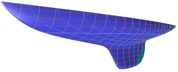 The keel is a B-spline Lofted Surface supported by 6 longitudinal mcs. The first one is a snake on the canoe body, defining where the keel is attached to the canoe body. The remaining mcs in this example are B-spline Curves, each supported by 6 cps.