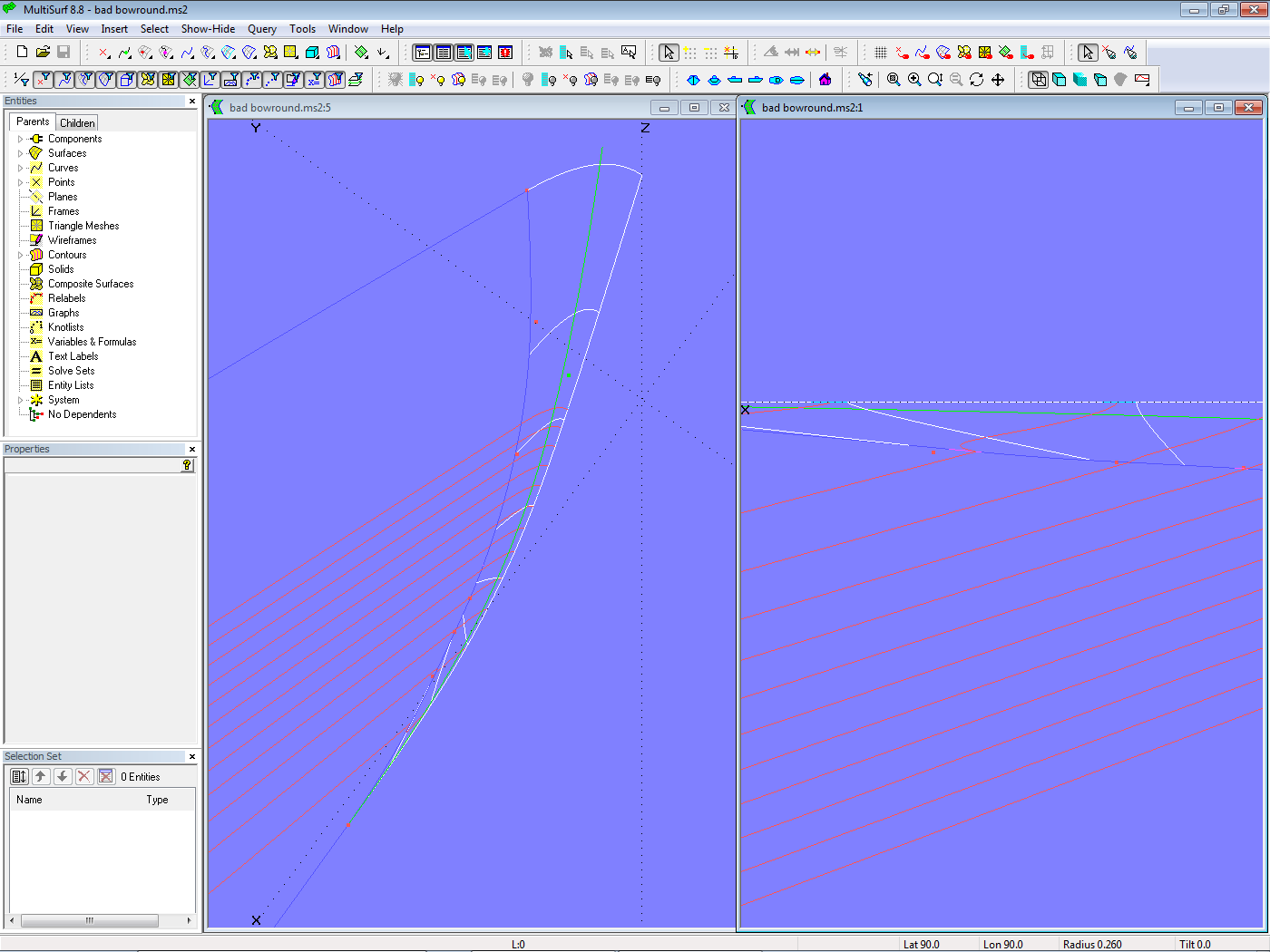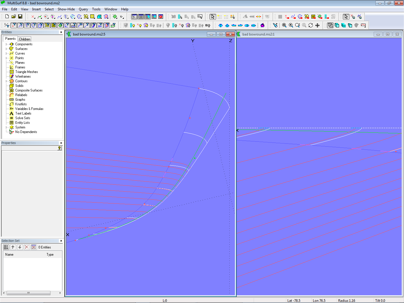 The model bad_bowround.ms2 shows wrinkles in the lower waterlines. The bowround is a B-spline Lofted Surface supported by 3 mcs: mc1 is a snake on the hull surface defining the start, mc2 is the stem mc of the hull surface, and mc3 is the projection of mc2 on the centerplane. Quite a standard construction.