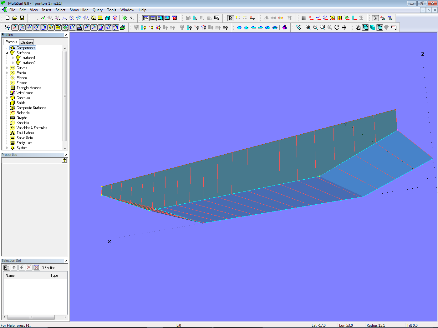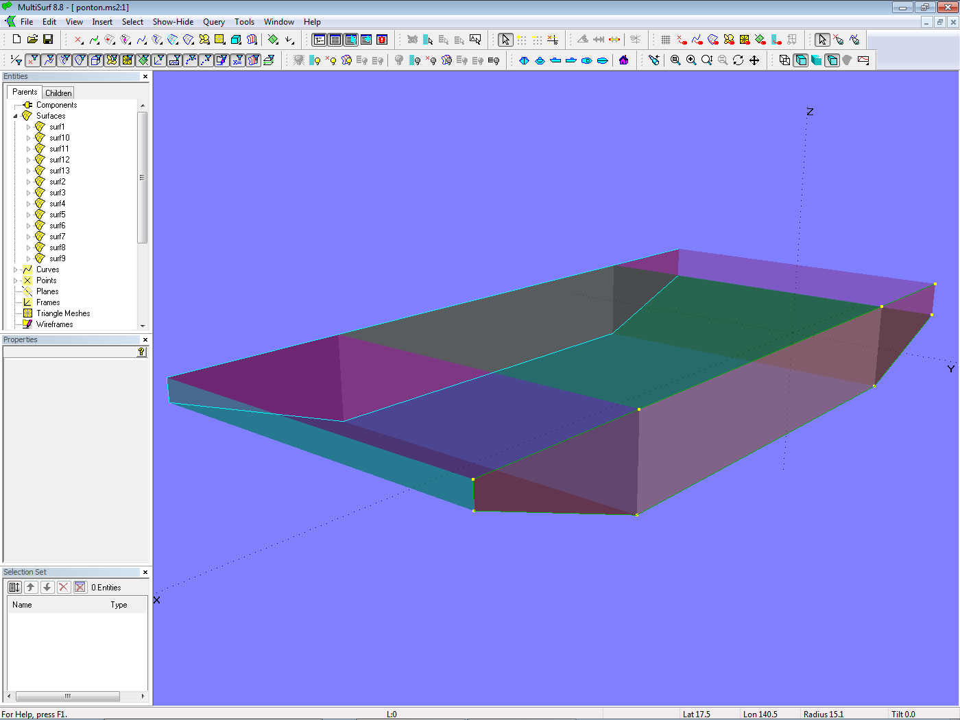 Model ponton.ms2 shows an ordinary pontoon-like vessel. It is composed of 13 surfaces.