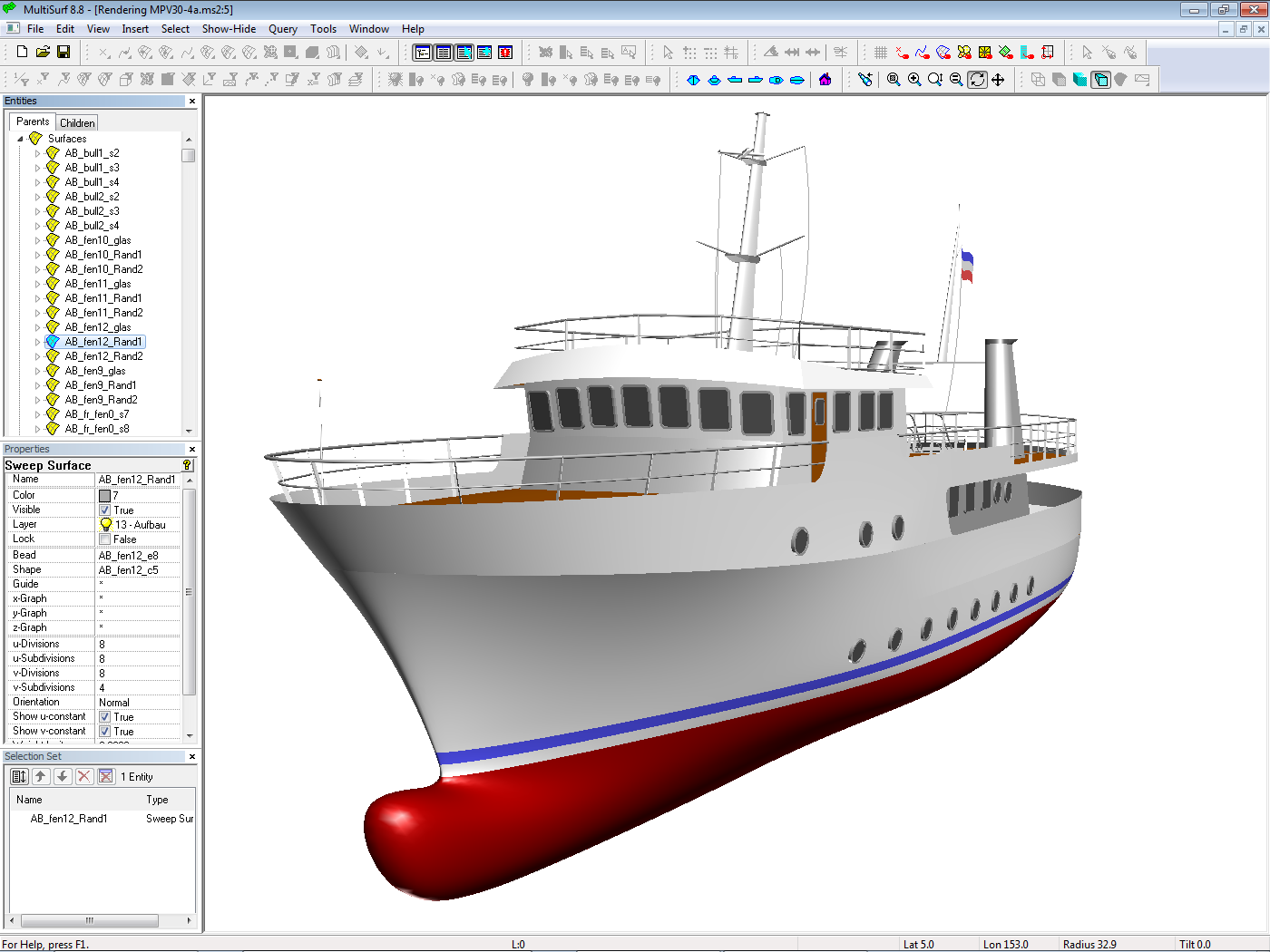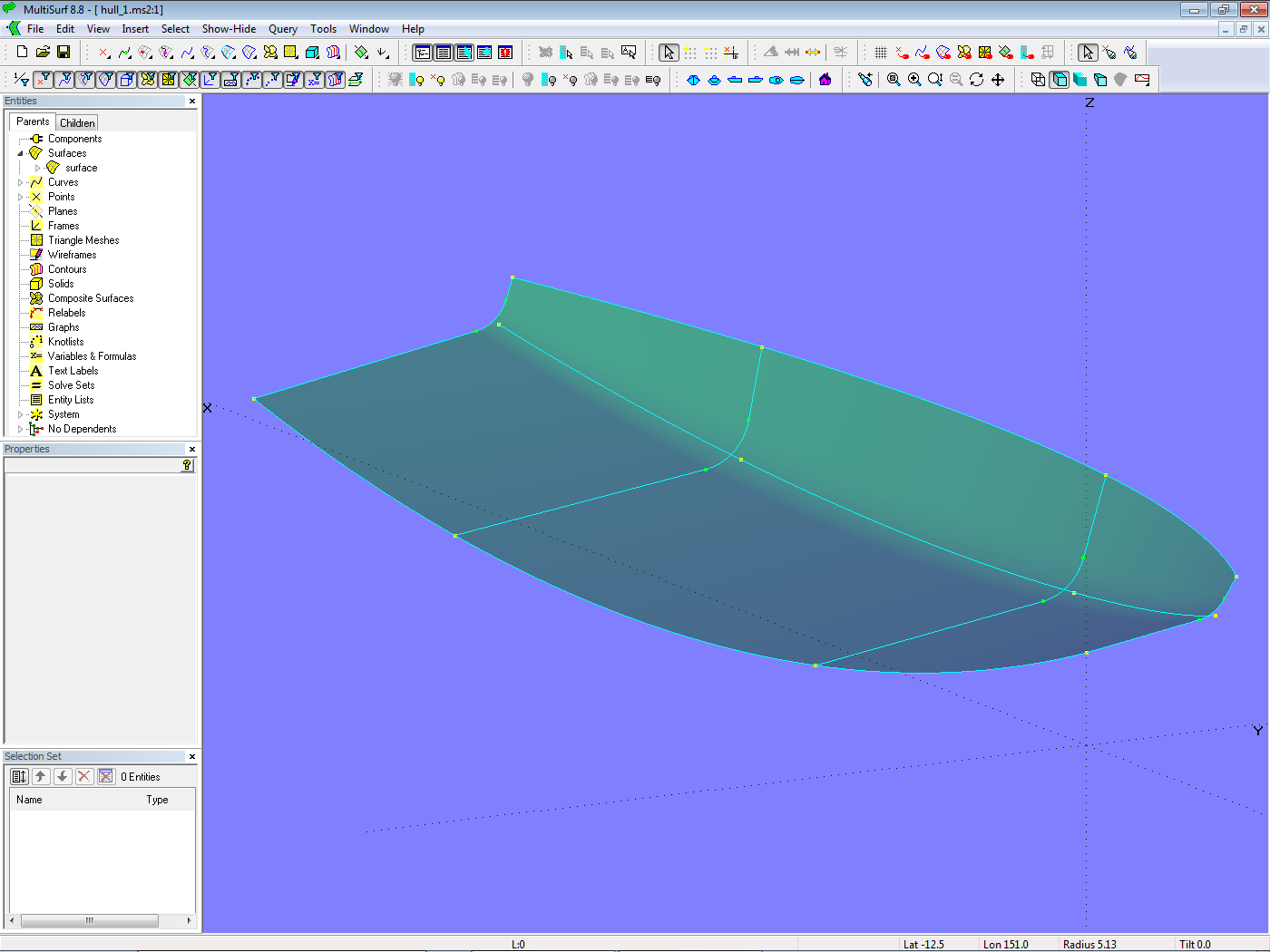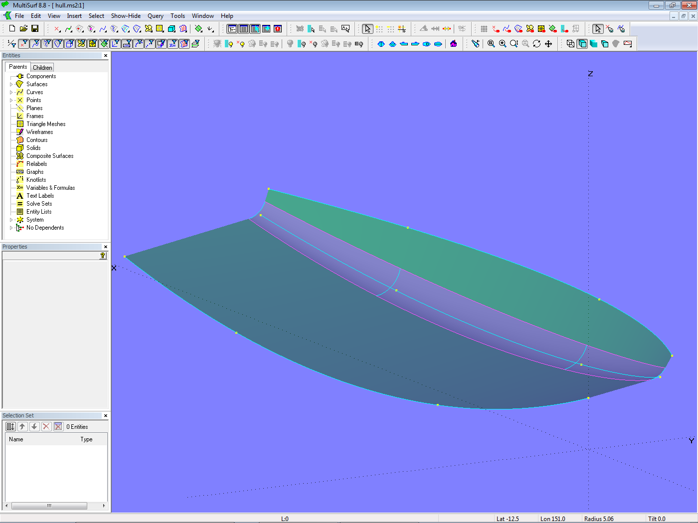 The model hull.ms2 shows 3 longitudinal surface strips. Surface1 (side) and surface3 (bottom) are Ruled Surfaces, while surface2 (bilge) is a C-spline Lofted Surface defined by 4 transverse Radius Arc mcs. Rounding off bow or stern will be more complex than with a single surface.