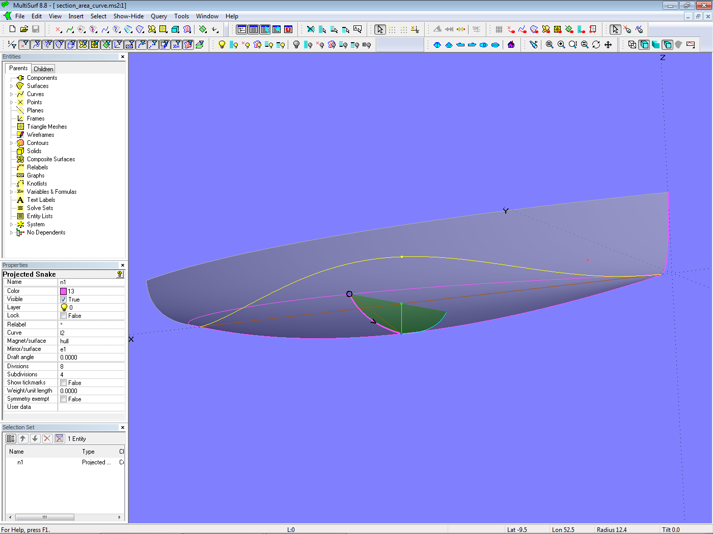 Snake n1 is mirrored against the centerplane, then both curves are spanned by the Ruled Surface immersed_section. Its area is determined by using the AREA formula and the value is assigned to the z-coordinate of the Point pt1. Finally, the Procedural Curve c1 illustrates, how the immersed cross section changes from bow to stern.