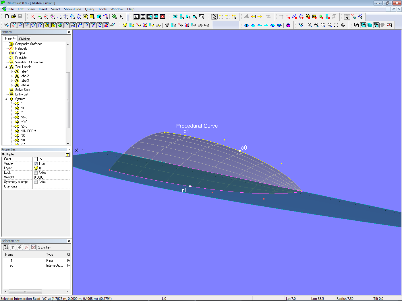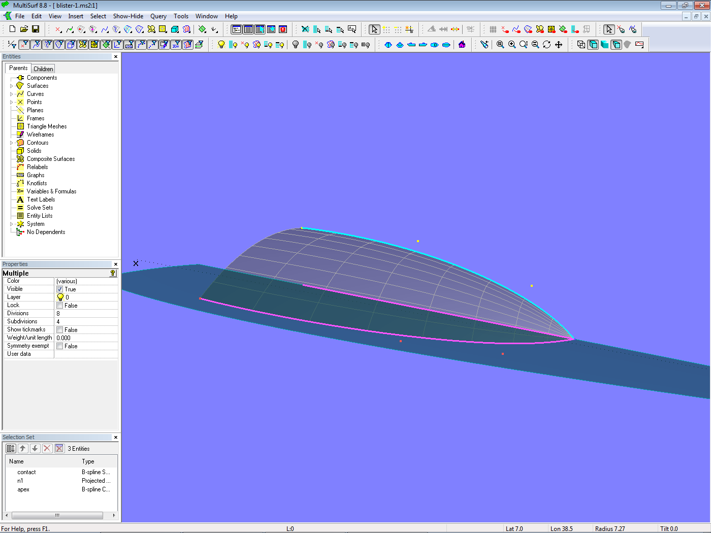 By using a simple procedural construction the apex curve cabin_top can be forced upon the t-parameter distribution of the contact curve cabin_foot (relabeling). This is shown in model blister-2.ms2.