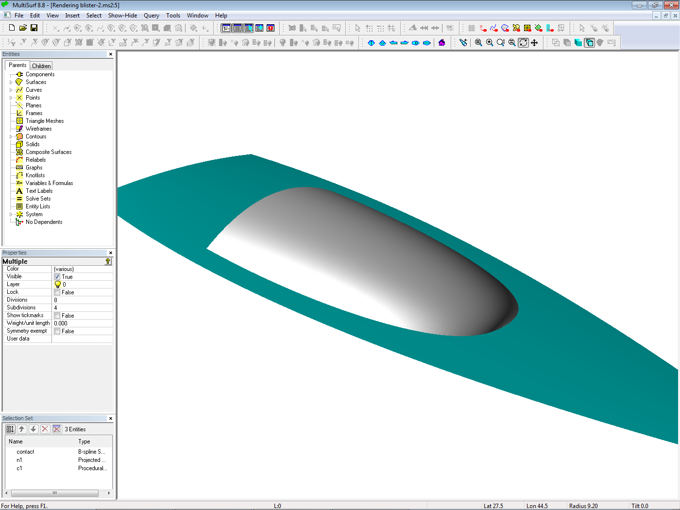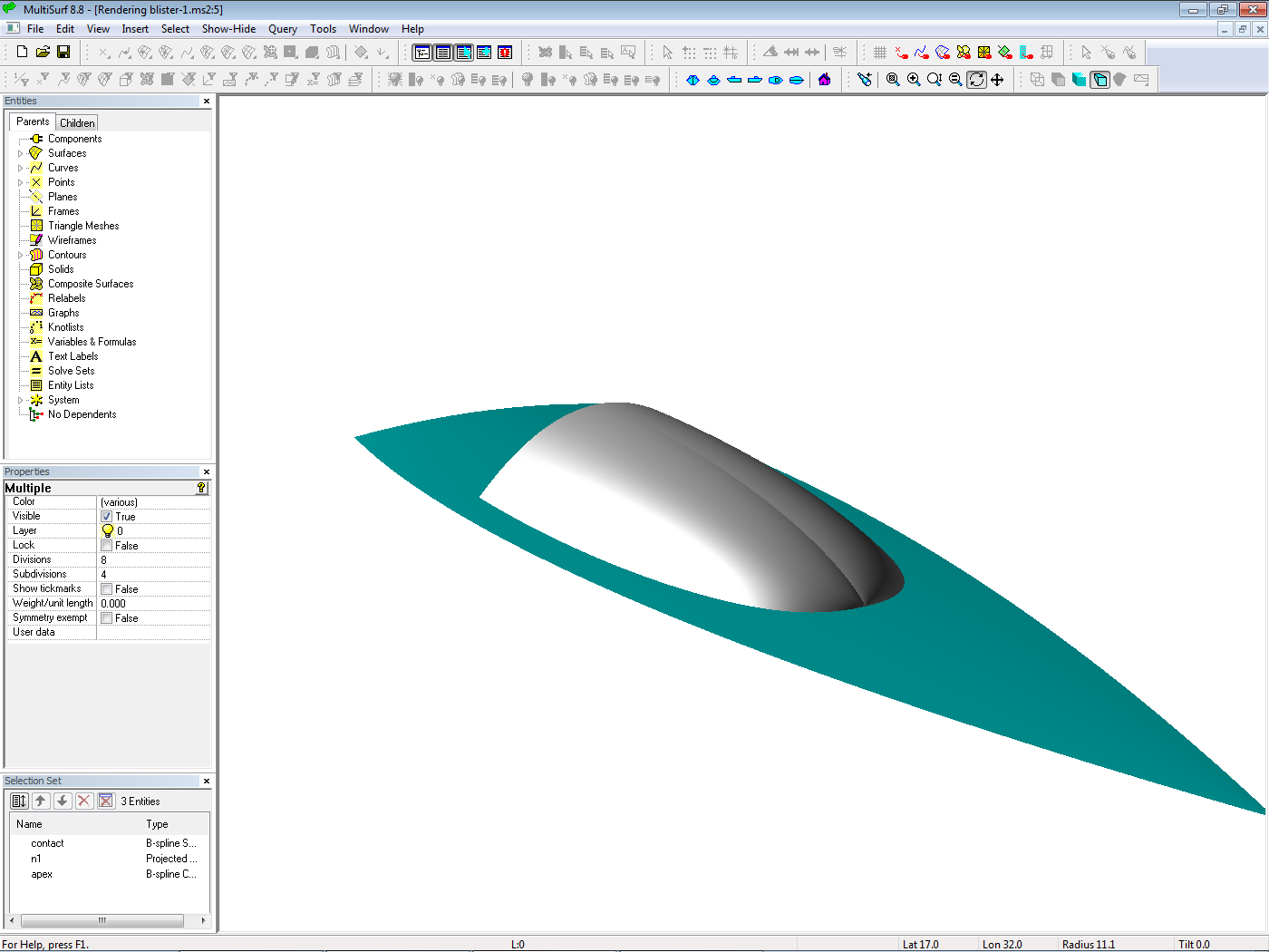 In model blister-1.ms2 a Blister surface is used to create a cabin. It mainly has three supports Snake1 identifies the parent surface and specifies the contact of the blister on that surface. Snake2 is a snake, magnet, or ring on the same surface as Snake1, generally located inside Snake1. Apex is a curve or point entity that specifies the apex of the blister. The Blister surface “softens” the area between the two snakes, bending it upwards until Snake1 touches Apex.