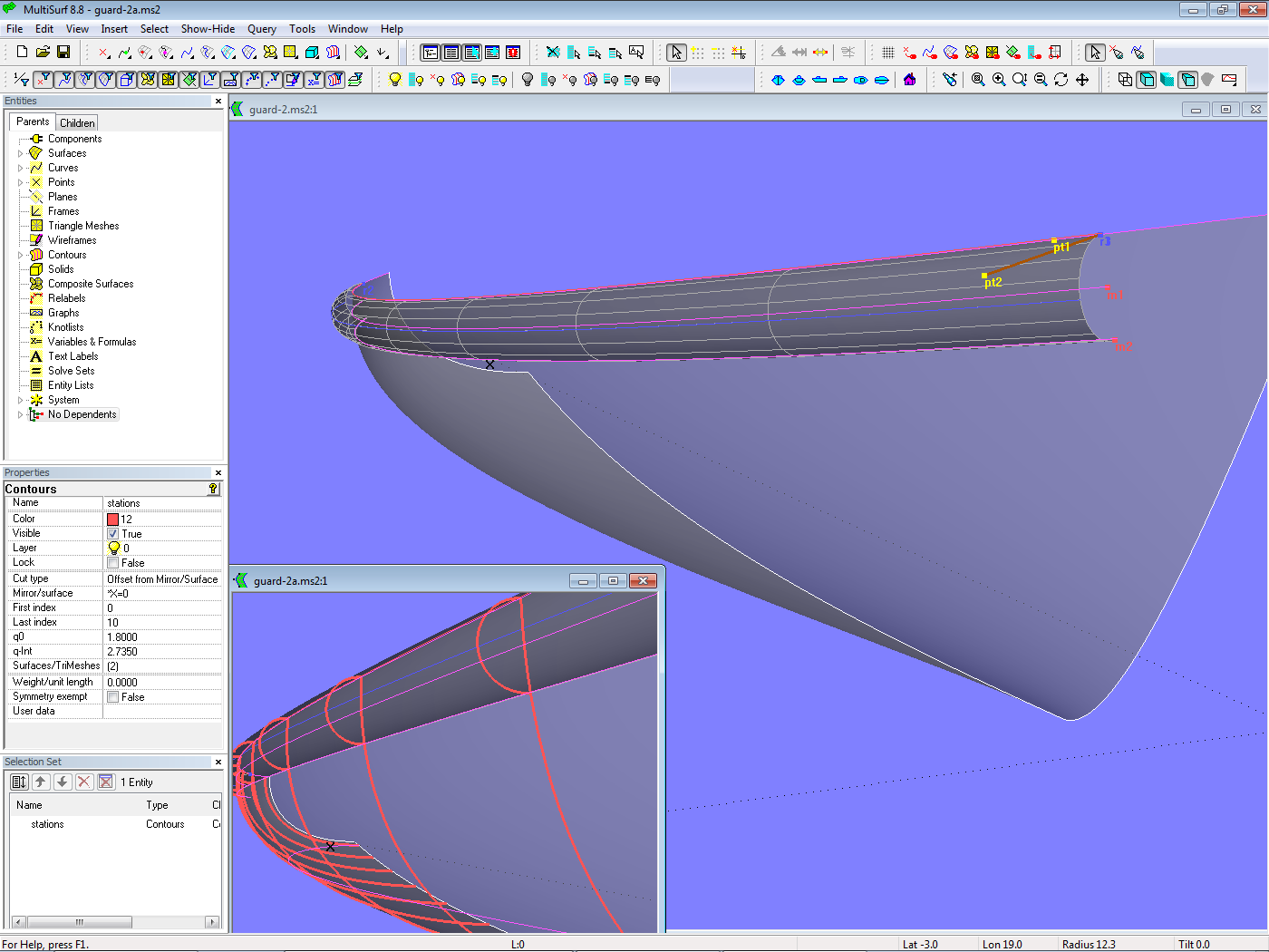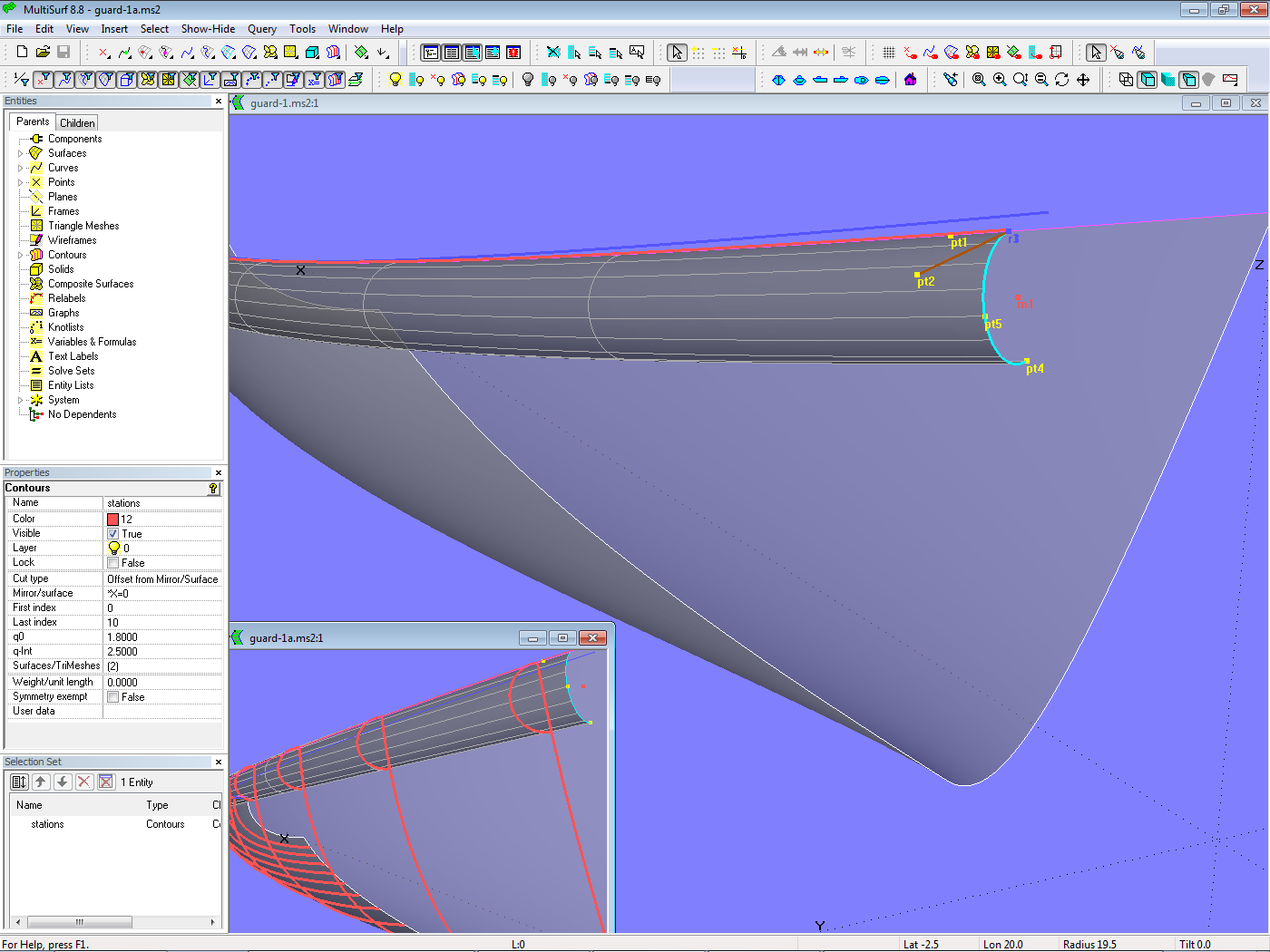 The basis setup is the same as in the previous model. However, the surface type for the guard rail is an Arc Lofted Surface. Its three longitudinal master curves are SubSnake n1 along the sheer, the Offset Curve c1 and the Procedural Snake n3. Support for the Offset Curve c1 is another Procedural Snake (n2).