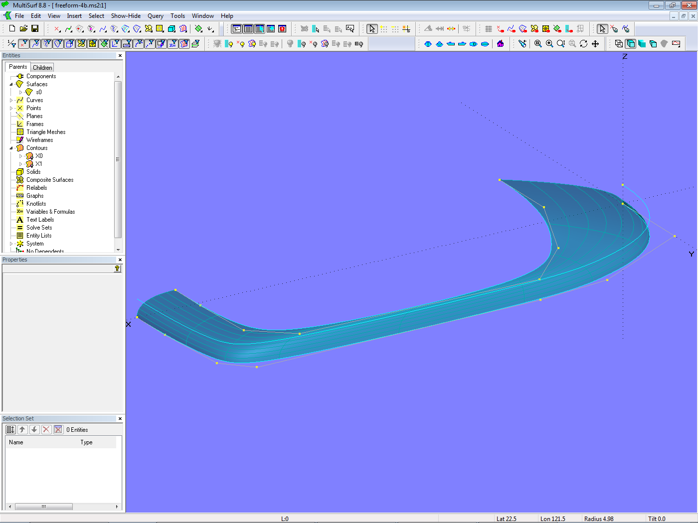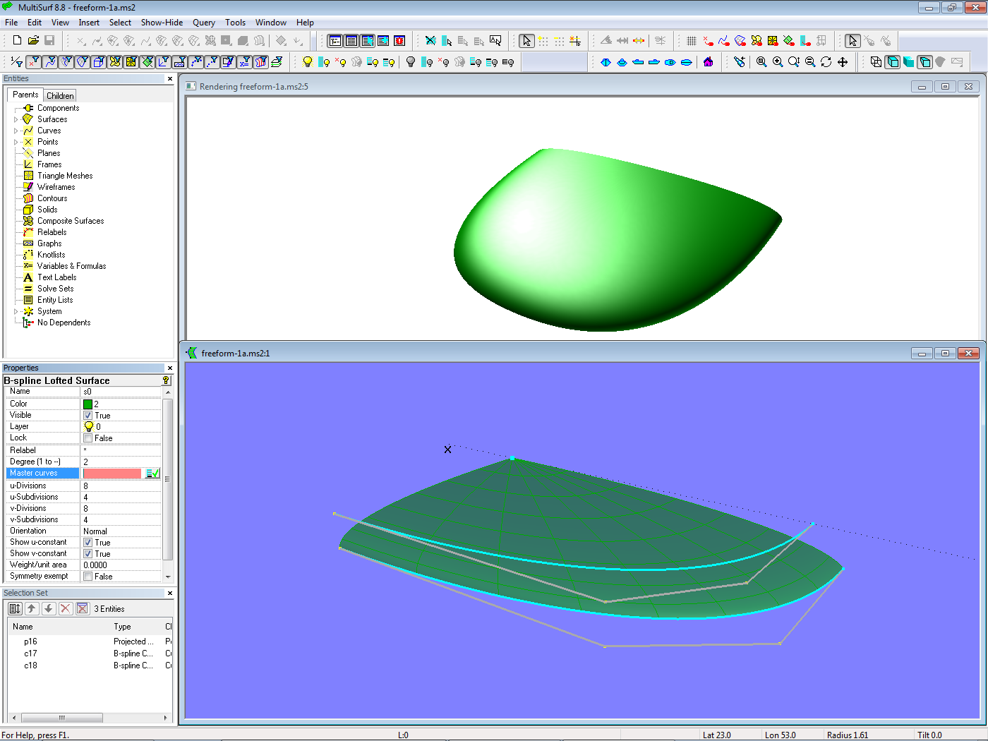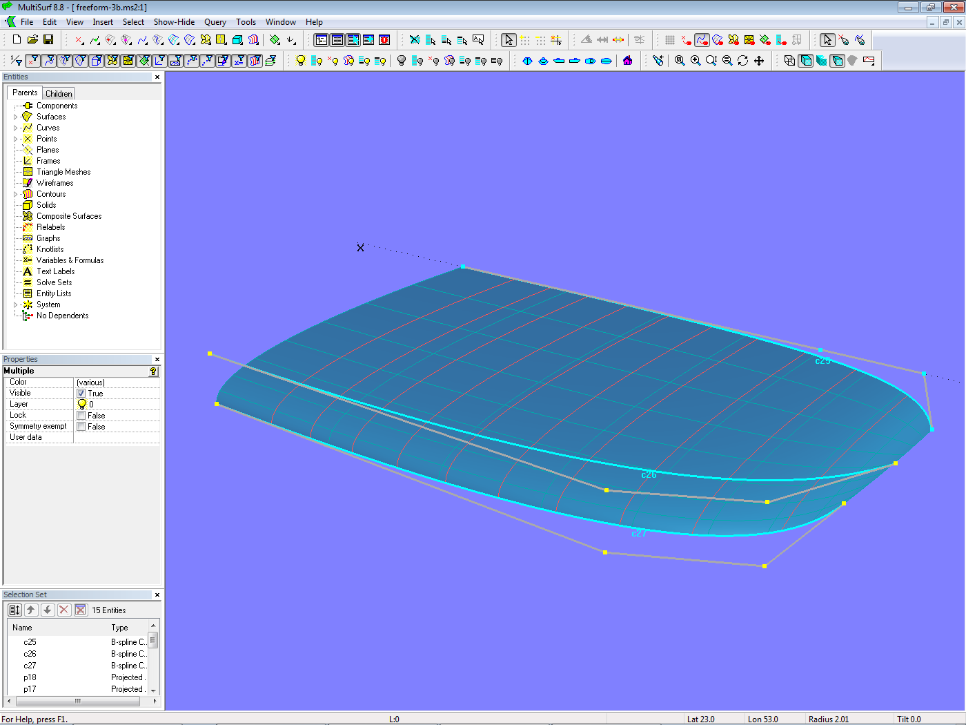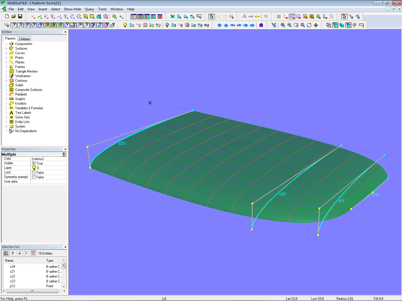 B-spline Lofted Surface on three supports – the B-spline Curve c0 determines the planform outline, c1 is a Copy Curve and the B-spline Curve c2 defines the form of the inner edge. The Copy Curve c1 is vertically above c0, so the surface starts vertically everywhere along the outer edge.