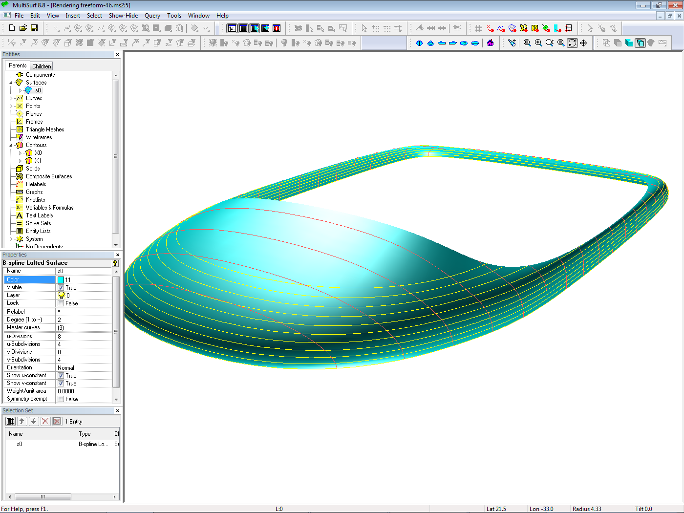 The B-spline Lofted Surface is supported bz 4 B-spline mcs, which run in transeverse direction. Mcs have same degree and number of control points.