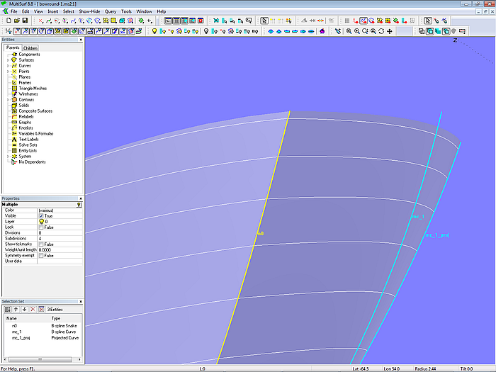 Model bowround-1.ms2 shows the simplest construction of a bowrounding, a B-spline Lofted Surface with three support curves – a snake on the hull surface, where the bowround starts, the first hull mastercurve and its projection onto the centerplane.