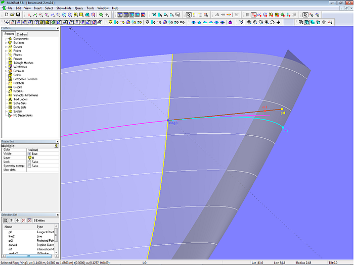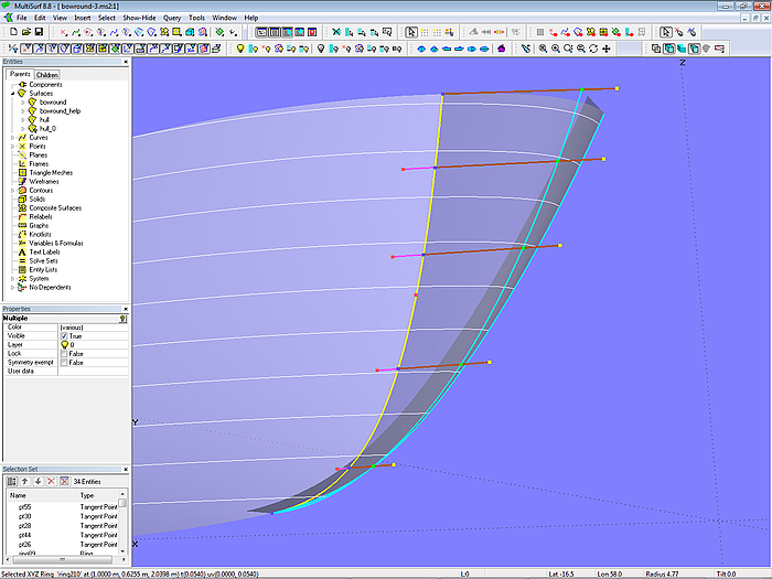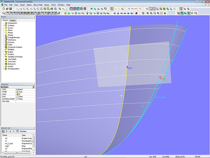 Model bowround-4.ms2 shows an alternative to the previous models. First, at the position of the Ring ring3 on the snake n0 (beginning of the bowround) the tangent plane to the hull surface is generated using an Offset Point. Next the 1st mc of the hull surface is projected onto the centerplane (Projected Curve mc1_proj). Now ring3 is copied onto it as Copy Bead e1. This bead is then projected onto the tangent plane as Projected Magnet m1, perpendicular to the centerplane. The construction of this Projected Magnet is repeated for all positions of ring3 as Procedural Curve c1. Snake n0, Procedural Curve c1 and Projected Curve mc1_proj are now the parent curves of the B-spline Lofted Surface bowround.