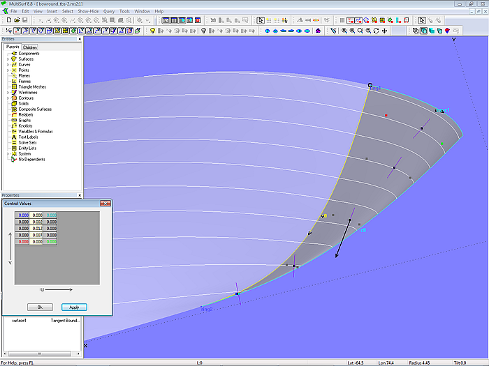 The number of u-control values is then set to a minimum of 3; this results in a single free interior control point, which must be visually positioned to achieve a fair run of the waterlines (model bowround_tbs-2.ms2).
