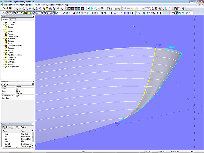 The parents of the Tangent Boundary Surface are curve1, c0, ring2 and n0. Curve1 is a B-spline Curve at the top of the bowround; it starts tangent to ring1 on the sheer edge of the hull and ends normal to the centerplane. C0 is the projection of mc_1 of the hull onto the centerplane. Ring2 is located at the t = 1 end of snake n0 on the hull, where the bowround starts.