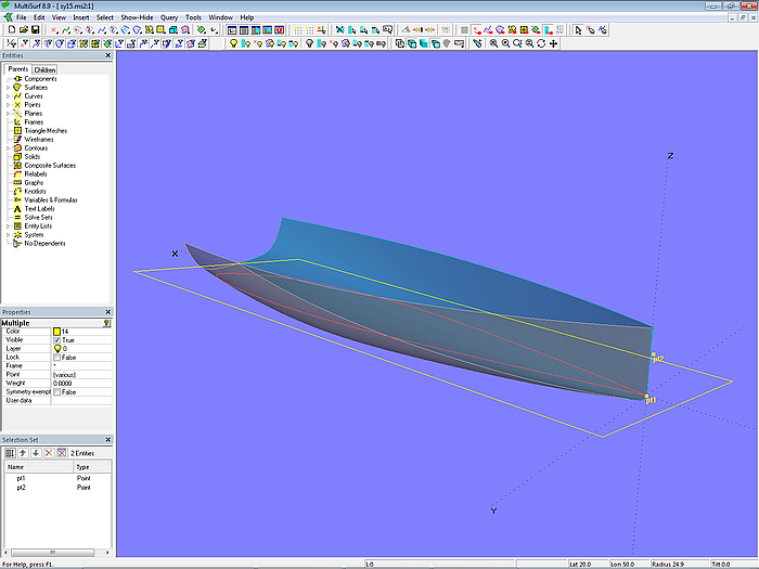 Both surfaces are cut by the Contour heeled_wl, which uses the 2-point Plane plane1 as Surface/mirror support. The supports for this plane are the Points pt1 and pt2. The Coordinates property of pt2 is set to Polar, so changing its Latitude value heels the plane. Sink is controled by the Z-coordinate of pt1.