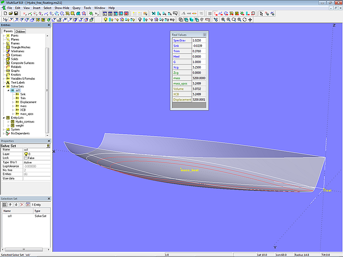 While in the previous model just a raw picture of the situation under heel is available, model sy15_heeled_dwl.ms2 provides accurate geometry. Basis are the hull surface hull and the Roll_Pitch_Yaw Frame frame1 (RPY Frame). Origin of frame1 is the point sink.