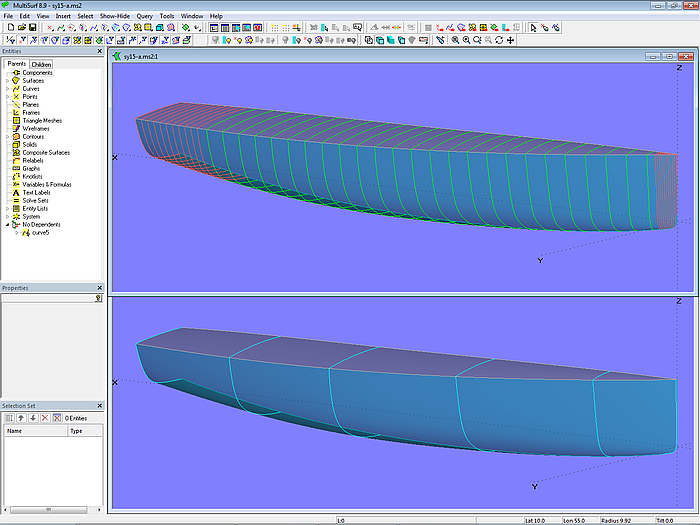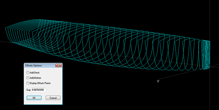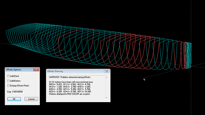 A model showed a problem with View/ Offsets. The default “Gap” value worked fine, but was considered too big to take into account details of the keel bulb. A reduction of “Gap” caused station loops with zero enclosed area. In model sy15-a.ms2 the problem is imitated.