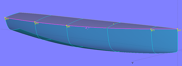 This creates a gap between cp1 of mc3 (Point p31)and the first cp e2 of the deck master curve db3 (about 8 mm). The deck edge is slightly outside the hull edge, in the bow area it is the other way around.