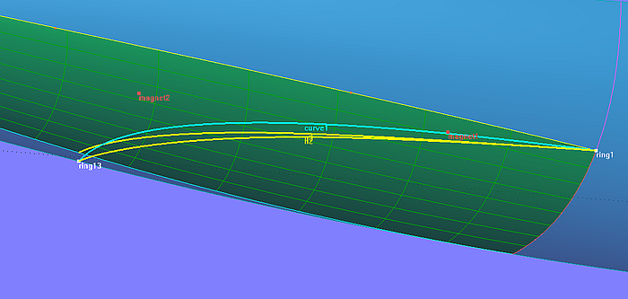 Bottom surface is the Ruled Surface bottom, simply spanned between PolySnake n3 (on topside_0) and the PolyCurve c0, which is a combination of the forward part of the keel (B-Spline Curve keel0, degree = 2)) and its aft part, the B-spline Curve keel1 (degree = 1).